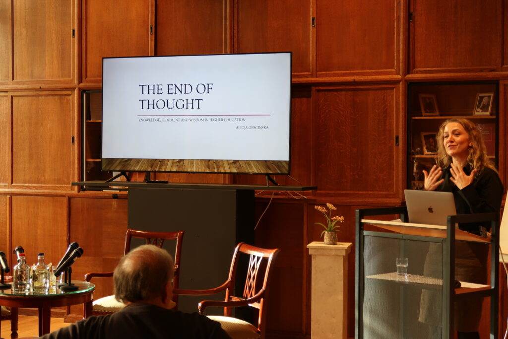 Alicja Gescinska structured her contribution around a quote from Roger Scruton: ‘Thinking, real thinking, no longer happens at universities.’ Underneath the problems universities display on the surface, she identified the lack of knowledge and knowledge-based education as one of two core issues. The other: a lack of judgment. In a time where judging others is frowned upon, we need to strive for the return of proper judgment, as a sign of maturity, a ‘right of passage’, as Scruton called it in his 2009 Farewell to Judgment.