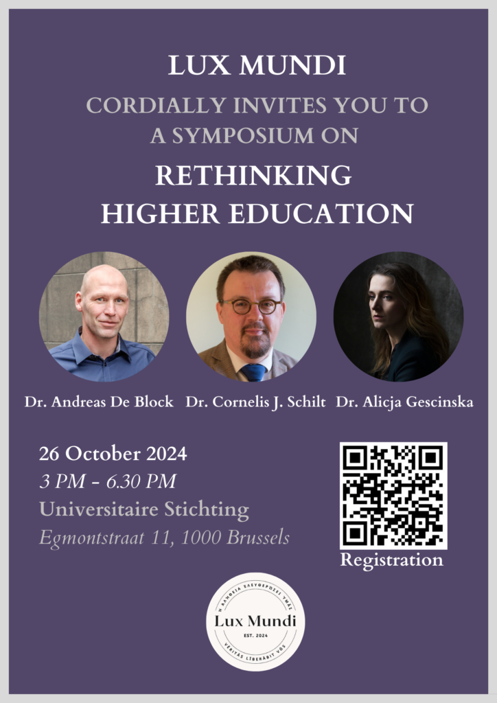 Please join us on Saturday 26 October, 15:00-18:30, at the University Foundation Brussels, to discuss the current crisis in higher education and how to move forward. With Prof. Dr. Andreas De Block, Dr. Alicja Gescinska, and Prof. Dr. Cornelis J. Schilt. Symposium and discussion are followed by a drinks reception. Register here or via the QR-code in the poster below.